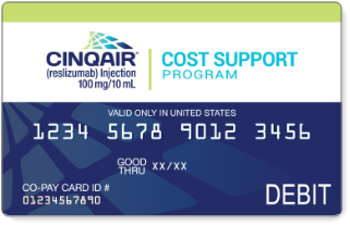 Patients use the CINQAIR® Cost Support Program Card to pay out-of-pocket costs for treatment with CINQAIR®.